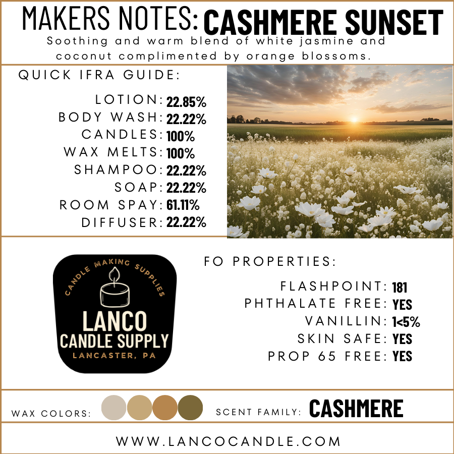Bottles are filled by weight, not volume, levels will vary. Individual usage rates may vary. Please refer to the IFRA sheet for the appropriate fragrance oils. Testing by Lanco Candle Supply does not substitute your own testing. Use caution and best safety practices such as gloves, eyewear, etc. when handling pure fragrance oils. Store fragrance oils in a safe area away from children and pets. Lanco Candle Supply is not responsible for fragrance oil misuse or handling.