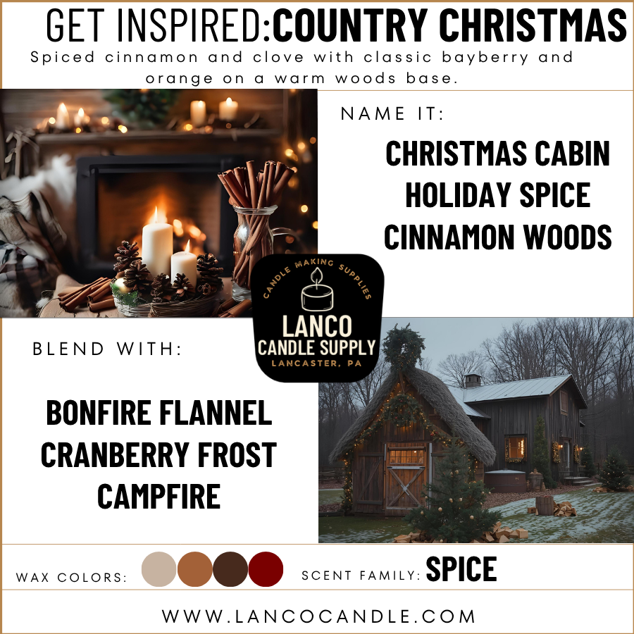Escape to a festive winter retreat with our Country Christmas fragrance oil. This expertly crafted blend opens with invigorating spicy cinnamon, clove and bright orange zest, complemented by tart cranberry and classic bayberry notes. The composition settles into a grounding warm woody base that lingers beautifully and feels like a cozy Christmas in the country.